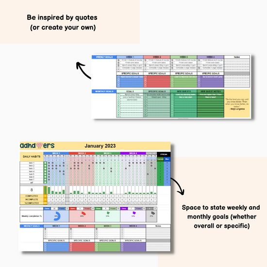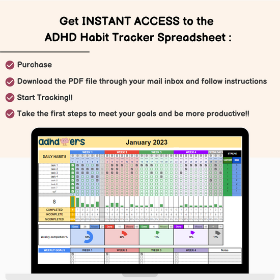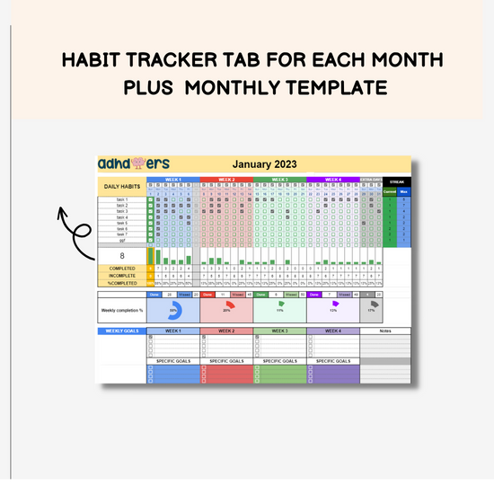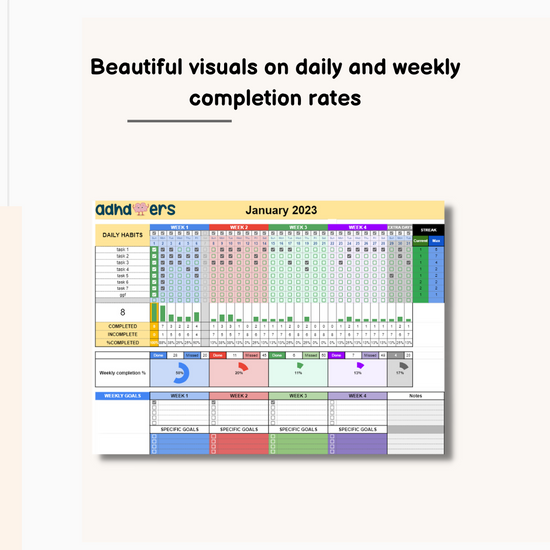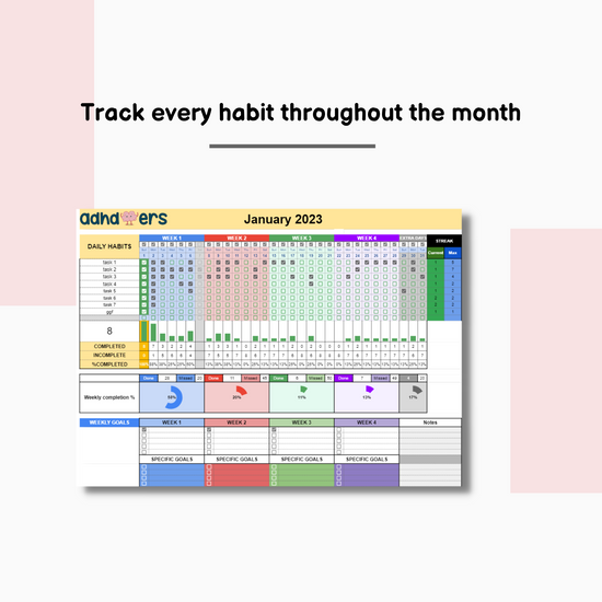 Made by ADHDoers for ADHDers - our spreadsheet helps you to track your habits in a fun and engaging way!